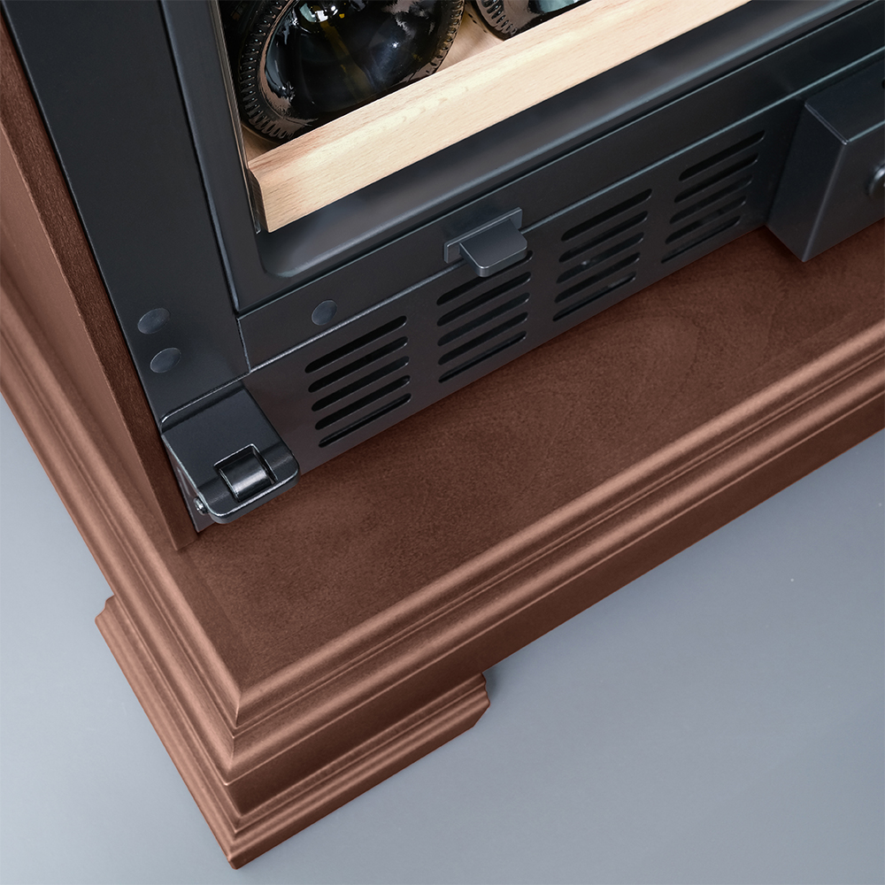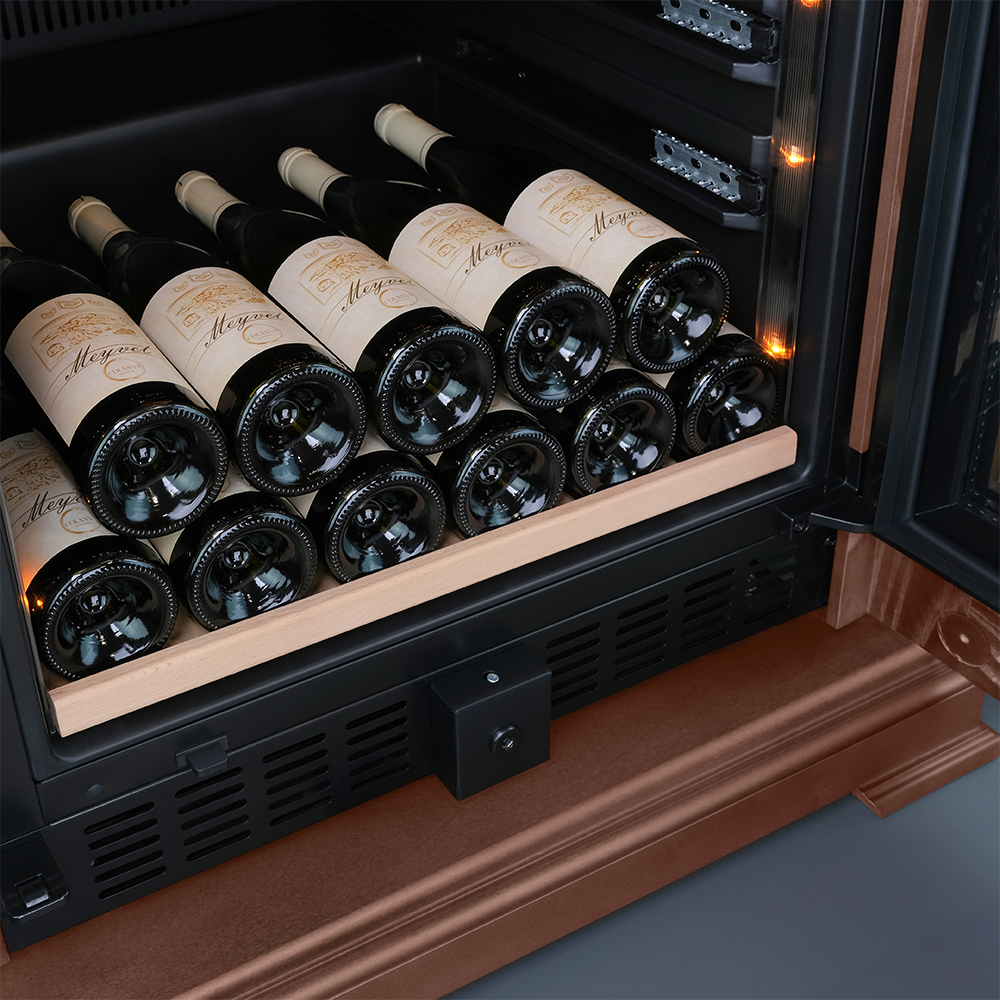Винный шкаф предназначен для профессионального и длительного хранения различных сортов вин (до 174 бутылок типа Бордо). Он так же оснащен дверью с защитой от ультрафиолетовых лучей и поддерживает влажность в диапазоне 60-80%, как в настоящем винном погребе. Стальной корпус обшит натуральным буком, который выдерживает большие нагрузки и обладает красивой текстурой.