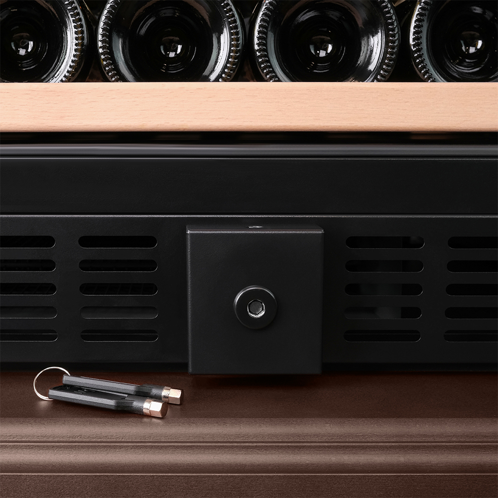 Винный холодильник оснащён надёжным и экономичным компрессором. Есть ручка, вентиляционная решётка и замок.